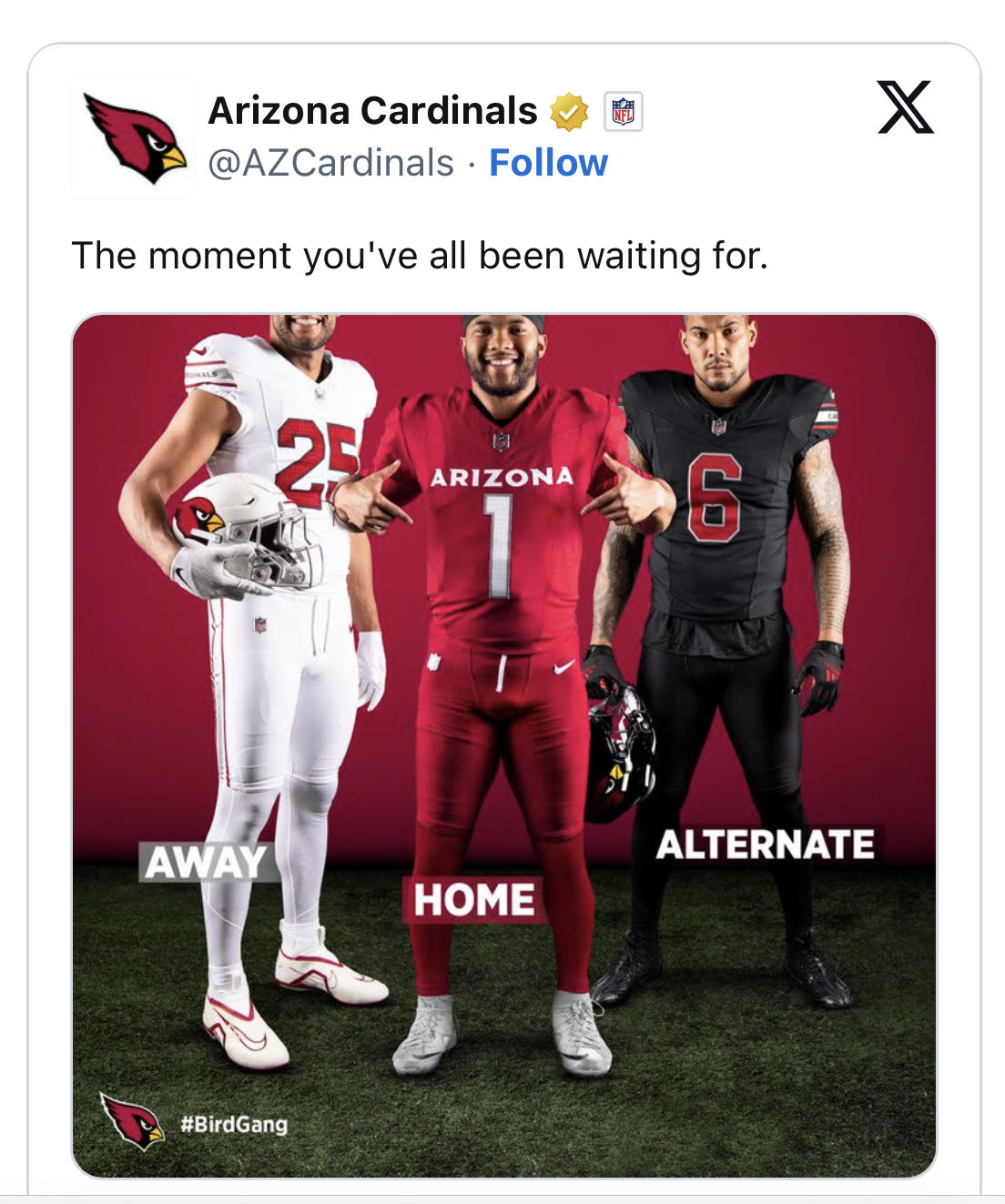 Cardinals – I grew quite fond of the Cardinals when I lived in Arizona. They had their new state of the art stadium completed in 2006 and my dear friend Ashley’s dad had season tickets, which he was generous enough to share with us. Prior to the games he would plan and prepare an entire tailgate for us in 100+ degree heat with little to no help and never complained once. Shout out to Jerrs, miss you! I’ll also never forget attending a game with Adam as one of our first official dates. His agent got us tickets in the nose bleeds lol we had a lot of fun. Anyway, back to the topic at hand, the Cardinals are debuting a new set of jerseys this season. They are a little underwhelming in my humble opinion, but they do the trick. The Cardinals haven’t had a uniform refresh since 2005 and I feel they missed an opportunity to be a lot cooler than they are. The desert is filled with so much color and inspiration. As I was writing I became curious about the Carinal namesake and color combos, so I researched it and found out that the team acquired its nickname in 1901 when its founder, Chris O’Brien, received a shipment of faded jerseys from the University of Chicago Maroons football team that were cardinal red in color. Talk about random! I do really like their Arizona font on their new jerseys. They nailed the AZ vibes with that, and the black is pretty slick. Definitely could do without the white set, which is eerily similar to the Ohio State Buckeye unis. Fans set Twitter ablaze this last Spring when the Cardinals put out the below tweet…The moment you’ve all been waiting for.? Womp, womp.