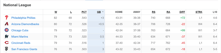 The San Francisco Giants 2023 season has been confusing to say the least. For those who don’t know they are in a highly competitive National League West wild card playoff race to close out the season. The NL West wild card race has been very entertaining especially before the Giants blew it this past weekend in Colorado against one of the worst teams in the league who have the chance to lose 100 games this season. The Giants are in a pennant race with the Chicago Cubs, Miami Marlins, Arizona Diamondbacks, Cincinnati Reds, and Philadelphia Phillies who seem like they will grab the number one wild card seed. So that leaves two spots left for the 5 remaining teams I mentioned. Those five teams are all within a half to 3 games back! The top seed will get to chill for a minute + have home field advantage. While the other two teams will battle it out in a one game loser goes home playoff hosted at whoever has best head-to-head record. Here are the standings from ESPN.com